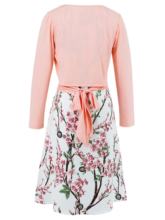 Tied Long Sleeve Cover Up and Printed V-Neck Dress Set